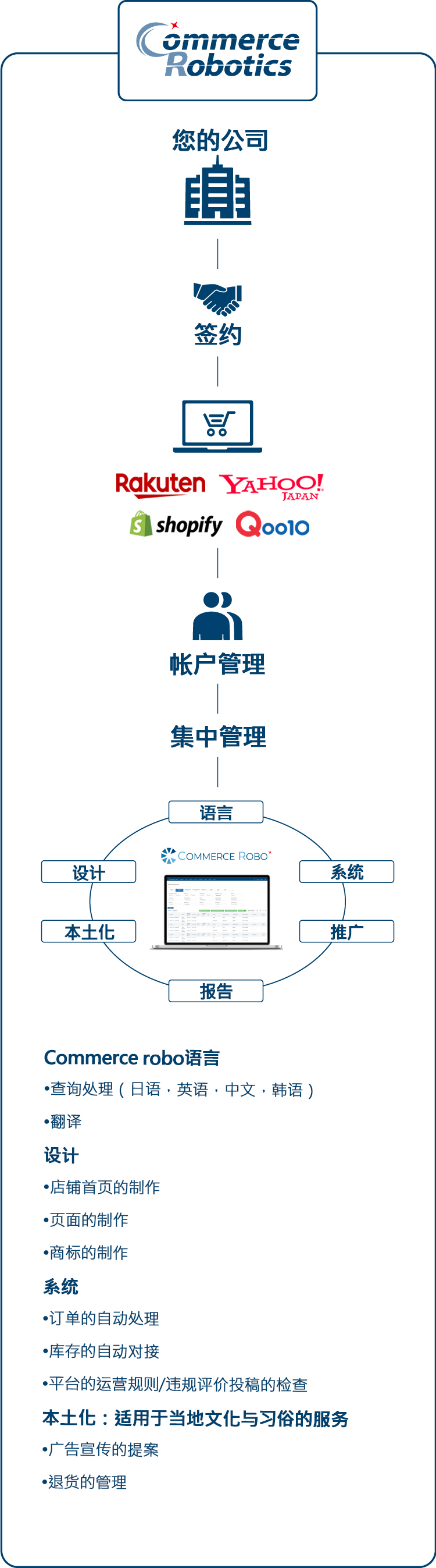 我们可以提供新规出店,扩大销售渠道等代理的EC服务 我们是日本最大的电子平台乐天和雅虎的官方合作伙伴。 来自欧洲、美洲、大洋洲、韩国和许多其他国家的公司都在与我们合作!