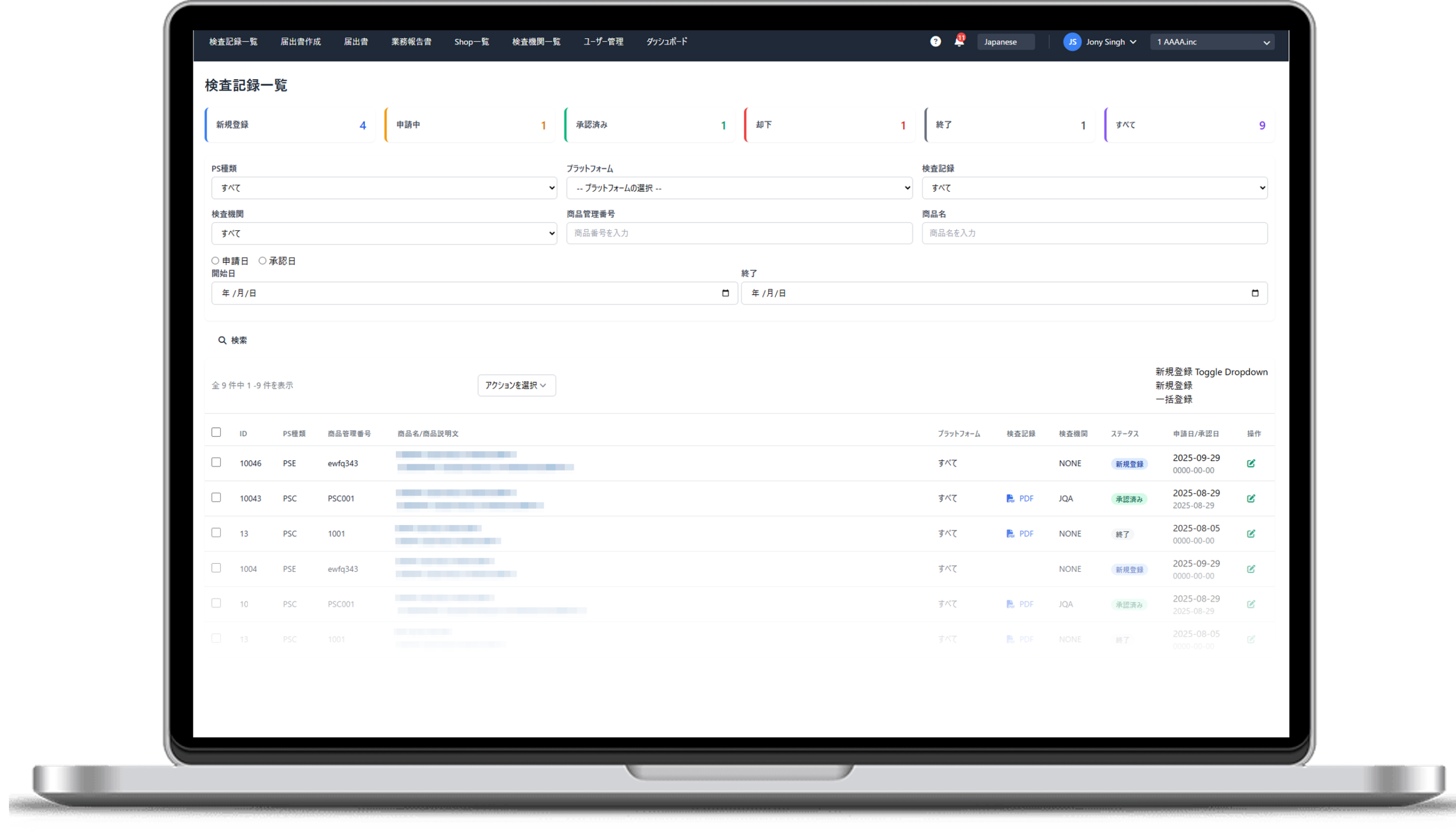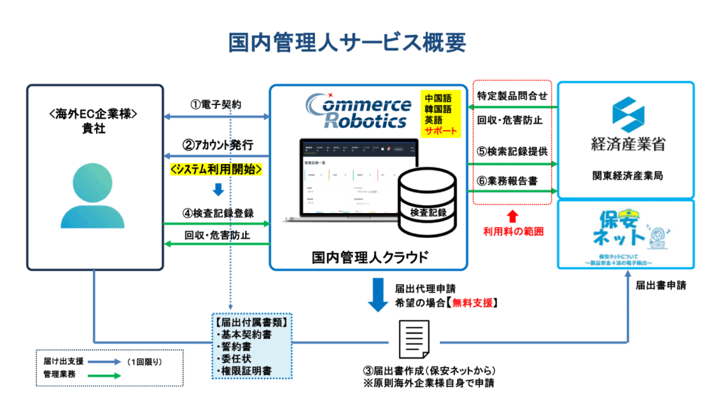 海外EC企業は、コマースロボティクスとの契約後、国内管理人クラウドのアカウントの発行を受けられます。販売開始前には、対象製品の検査記録をクラウド上にアップロードします。 コマースロボティクスがその内容を確認・承認し、監督官庁への検査記録の報告業務は、国内管理人クラウドを通じて一元的に実行されます。