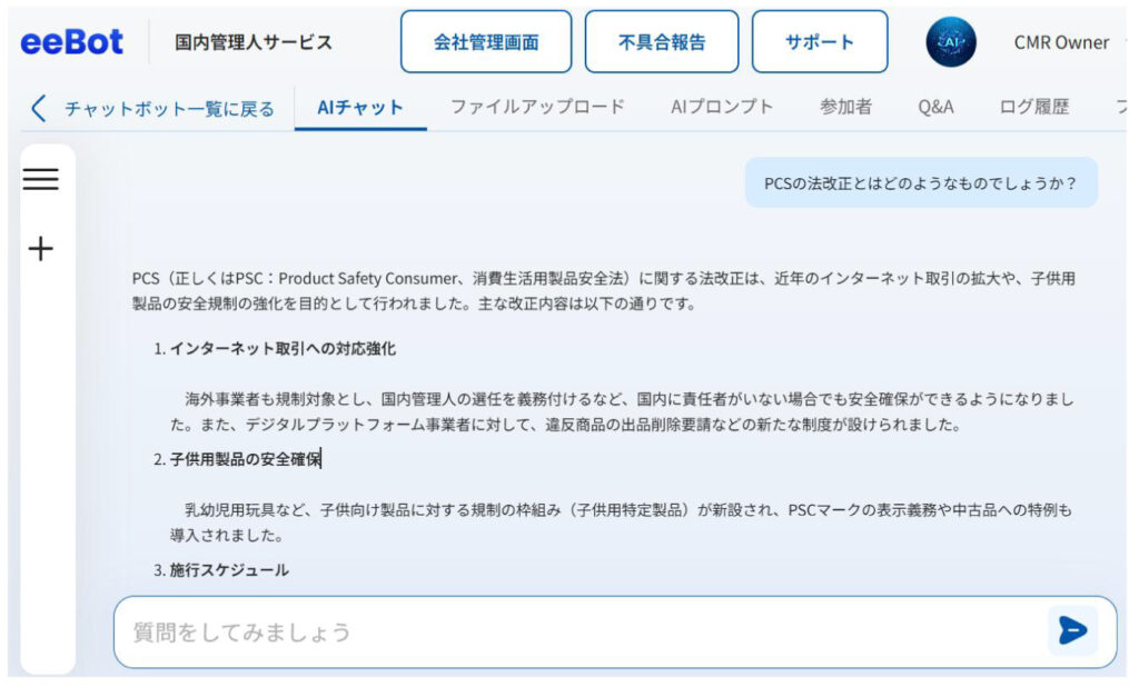 国内管理人クラウドの契約企業は、コマースロボティクスが自社開発した国内管理人AIチャットボット(AI RAG)を無料で利用できます。本チャットボットは、電気用品等の届け出書作成時に必要な区分判定についての質問や、関連法令に関する質問にも自動で回答します。